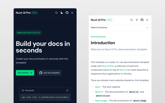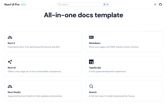 A ready-to-use documentation template integrated with Nuxt Studio. You can start writing your docs right away inside the content/